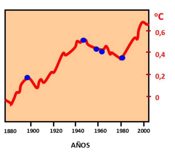 Complementariamente, la figura siguiente corresponde a una ampliación de la gráfica anterior, donde se muestra como las grandes riadas de los años 1944, 1957 y 1982 en Valencia y también la de 1962 en Barcelona, se produjeron también durante un periodo de enfriamiento. Cabe recordar que, en aquellos momentos, se creía que nuestro Planeta se abocaba a una nueva glaciación.