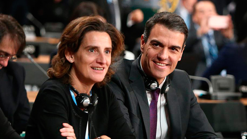 El presidente del Gobierno, Pedro Sánchez (d), junto a la ministra para la Transición Ecológica, Teresa Ribera (i).