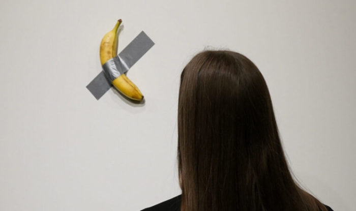 En la casa de subastas de Sotheby’s, siete compradores o sus representantes compitieron por adquirir la pieza titulada “Comedian”, del artista conceptual italiano Maurizio Cattelan, la cual consiste en un plátano colgado de una pared con ayuda de un gran trozo de cinta adhesiva plateada. Cabe señalar que ni siquiera era la misma fruta ya que se cambiaba cada pocos días por razones obvias de descomposición.