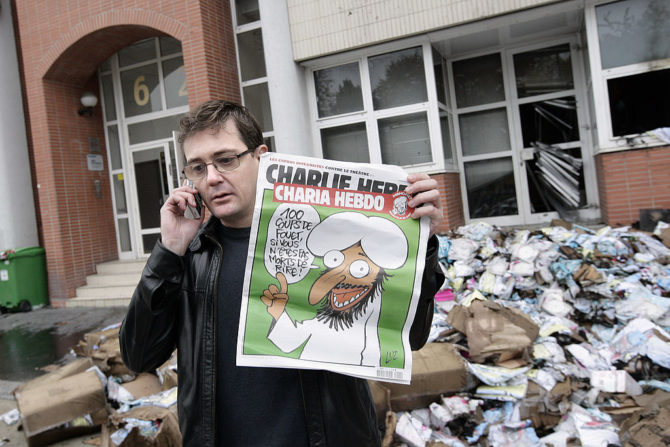 En la imagen (Alexander Klein/AFP via Getty Images), Stéphane Charbonnier, editor de Charlie Hebdo hasta que fue asesinado en el ataque terrorista contra la redacción de la revista (2015), frente a la antigua sede de la revista, el 2 de noviembre de 2011, luego de que fuera destruida por un ataque incendiario.