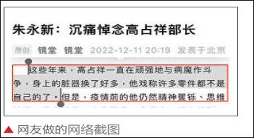 Captura de pantalla de parte del artículo de condolencia por Gao Zhanxiang