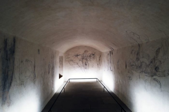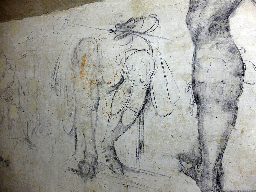 Mientras se escondía por temor a perder la vida, Miguel Ángel cubrió las paredes con bocetos. Ya fuera para calmar su corazón atribulado o para mantener activas su mente y sus manos, realizó numerosos estudios sobre su obra en curso, revisó trabajos anteriores y es posible que incluso haya dejado un raro autorretrato.