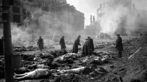 En la foto: cuerpos de civiles muertos tras el bombardeo de Dresde.