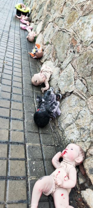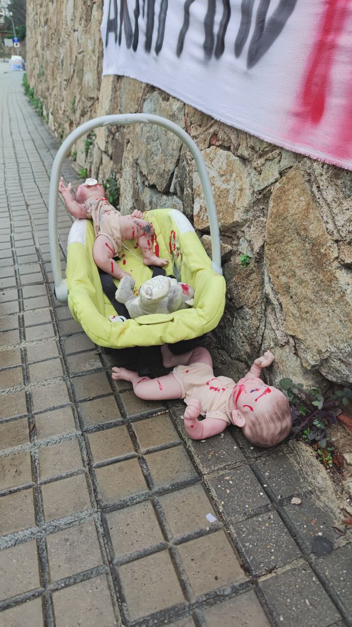 Para ilustrar su protesta, los manifestantes colocaron en la calle frente al Consulado General de los Estados Unidos en Barcelona muñecos manchados con pintura roja, simulando bombas rudimentarias.