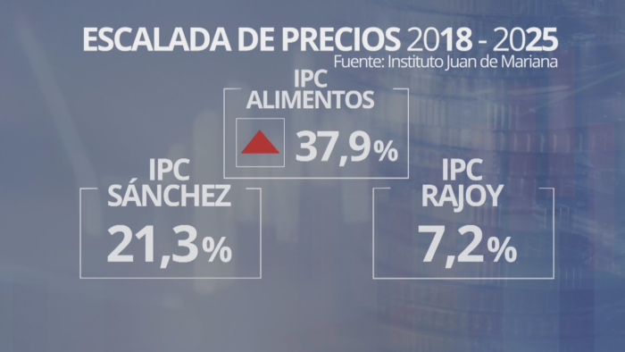 Los precios de los alimentos han subido casi un 38% desde julio de 2018 a febrero de este año. Según el estudio del Instituto Juan de Mariana, La inflación acumula un crecimiento de más del 21% con Sánchez en Moncloa, un 72% más que en la presidencia de Rajoy.