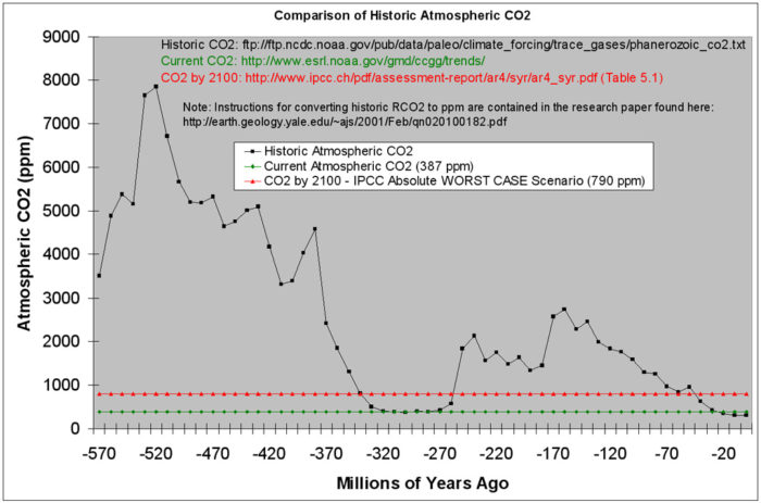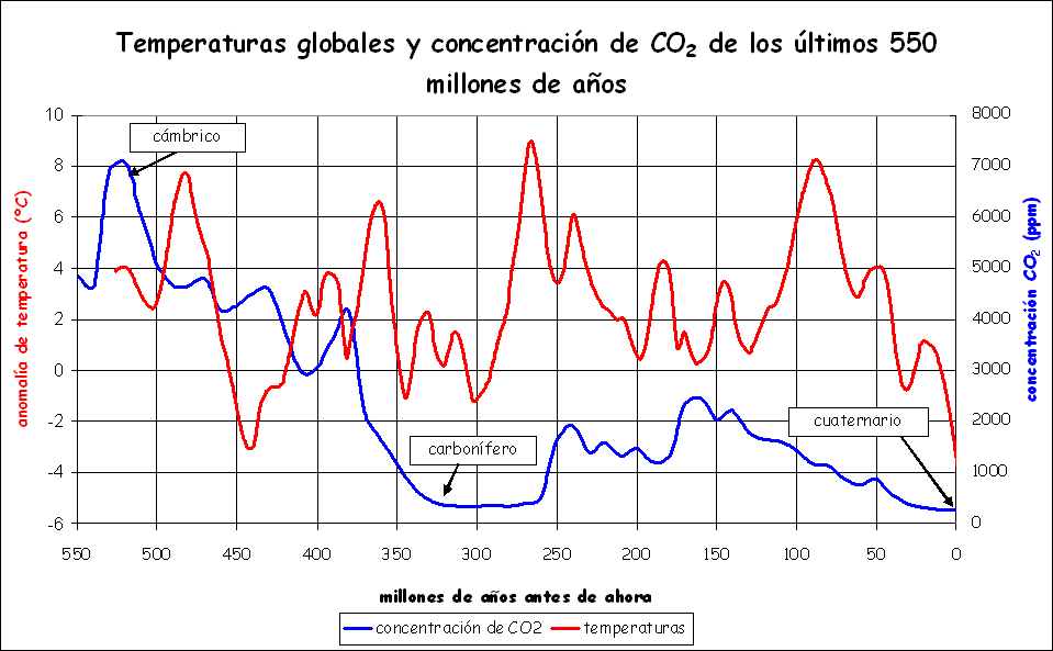 «La atmósfera de la Tierra contiene hoy unas 415 ppm (0,041%). Comparado a los antiguos tiempos geológicos nuestra atmósfera actual, lo mismo que la atmósfera del Carbonífero, ¡está empobrecida de CO2! En los últimos 600 millones de años de historia del planeta, sólo el Período Carbonífero y nuestra era actual, el Período Cuaternario, han sido testigos de niveles de CO2 inferiores a las 400 ppm. En cuanto a las temperaturas, Carbonífero Tardío al Pérmico Temprano (de 315 millones de años a 270 millones antes que hoy) es el único período en los últimos 600 millones de años donde tanto el CO2 y las temperaturas fueron tan bajas como ahora (Período cuaternario)».
