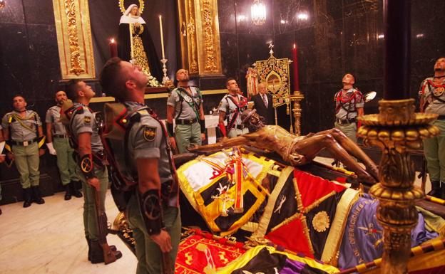 En la penumbra de la capilla, las miradas oscilan entre el Cristo yaciente cubierto por la bandera de la Legión y los cinco hombres con el arma clavada en el suelo y aspecto hierático. En ese extraño silencio, que apenas rompe el crujir de las botas de los legionarios cuando ajustan unos milímetros su posición o el clic de una cámara, la atmósfera se convierte en devoción.