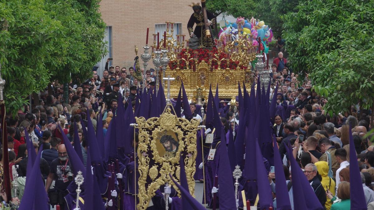Y da igual que el sol dé de lleno en la calle. Que el calor sea sofocante. O que no haya dado tiempo a digerir el almuerzo. En la avenida Salvador Barberá no se cabía ayer para ver bajar a una cofradía que sabe dosificar el esfuerzo a redoble de tambor. Avanzaba rápida, a buen ritmo, pero también sabía recrearse en la mecida con las marchas que interpretaba la agrupación musical Ecce Mater, de Cádiz, que se estrenó ayer en Málaga. El recorrido es largo pero Nueva Esperanza es experta en desmitificar distancias. Perdona a tu pueblo, Estrella Reina del Cielo o Cuando me alejo de ti sirvieron de banda sonora en la primera parte del recorrido del Nazareno del Perdón y sus Cirineos, que portan el ascua que es su trono. Cera morada en los faroles. Rosas rosa, rojas y lirios morados en el friso, para hacer contraste entre el oro y el risco de corcho, con pitas y altas ramas de romero junto a la cruz.