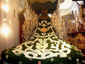 Las pinturas del rosario figuraban en las bambalinas exteriores, a modo de tarjas, presididas en el frente por un aparatoso escudo nacional. Estas pinturas fueron transferidas al palio de terciopelo celeste bordado en oro que sustituyó al precedente y que bordó Padilla en 1966, aunque esta vez situadas en las bambalinas interiores.