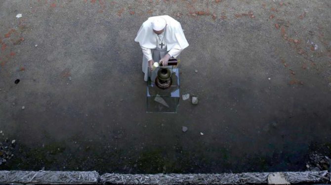 Entre tanto, Francisco sigue caminando, pausadamente y en silencio, entre barracones pulcramente conservados, escoltado por un grupo de gente estremecida, que ve cumplido el deber que el sentido católico de la liberalidad impone. Todos marcan el paso al unísono. En uno de los puntos, Francisco reza mientras un rabino canta en el idioma hebreo original el Salmo 130, un grito desgarrador a Dios conocido en latín como «De profundis». En Birkenau, Francisco recorre en silencio todo el memorial, parándose a rezar ante cada una de las 23 lápidas que, en cada uno de los idiomas de las víctimas, honran la memoria de “un millón y medio de hombres, mujeres y niños, en su mayoría judíos, asesinados” en ese lugar, según se nos recuerda a diario.