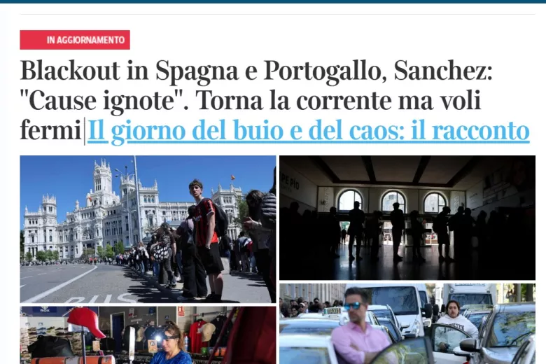 El diario italiano ‘La Gazzetta del Mezzogiorno’ abre con un titular claro: «Apagón masivo en España, Portugal y el sur de Francia también afectado». Apuntando que las causas aún son desconocidas y que el transporte e internet están bloqueados.