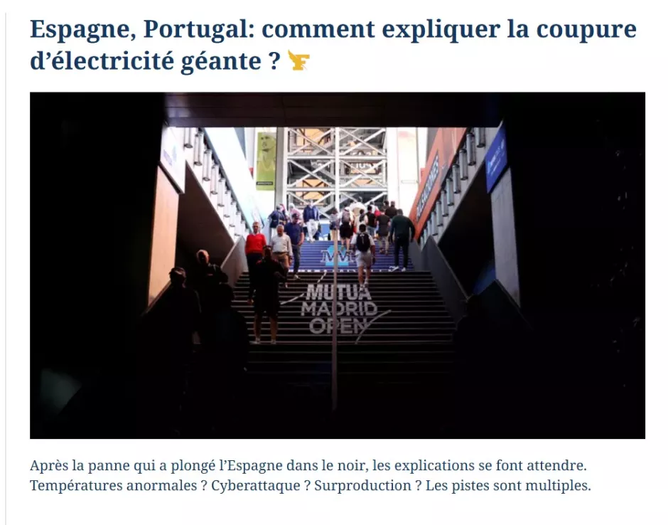 El diario francés ‘Le Figaro’ no se explica como ha podido ocurrir el corte masivo de luz en todo nuestro país y en los vecinos portugueses. Además, el medio francés explica cómo afrontar un apagón masivo. «Tras el apagón que sumió a España en la oscuridad, todavía se esperan explicaciones. ¿Temperaturas anormales? Ciberataque? ¿Superproducción?».