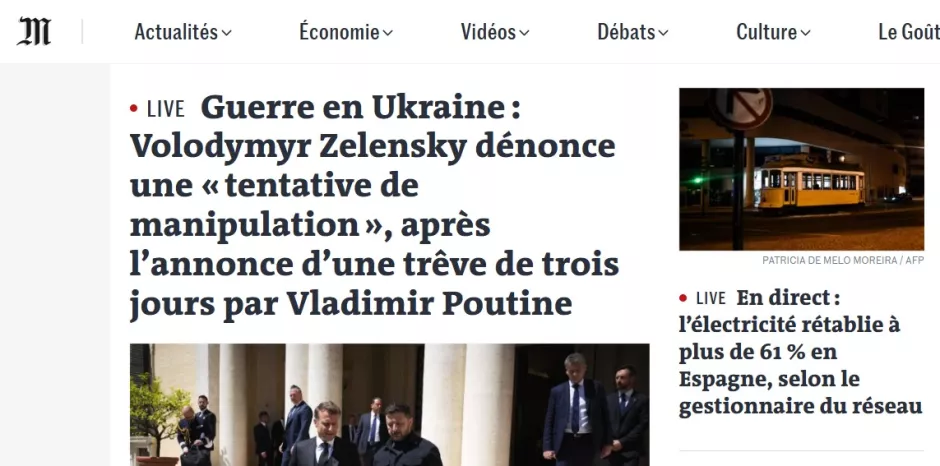 El diario francés ‘Le Monde’ abre su periódico con directo sobre el apagón masivo en el que explican que el suministro eléctrico se ha recuperado ya por encima del 61 % en España, según el gestor de la red eléctrica.