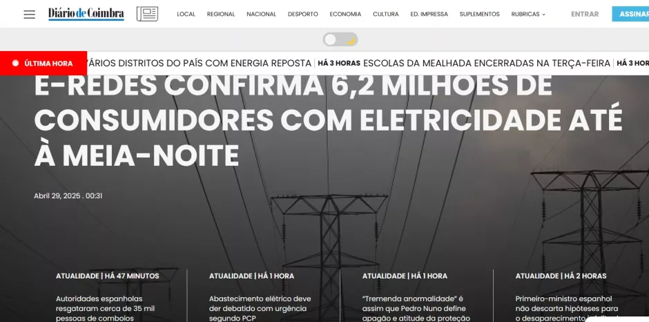 El diario portugués ‘Diário de Coimbra’ abre su portada confirmando que 6,2 millones de consumidores en Portugal ya cuentan con luz en sus hogares a medianoche. También informa que las autoridades españoles han rescatado a unas 35.000 personas atrapadas en los trenes, y que Sánchez no descarta que se produzca una escasez energética sin precedentes.