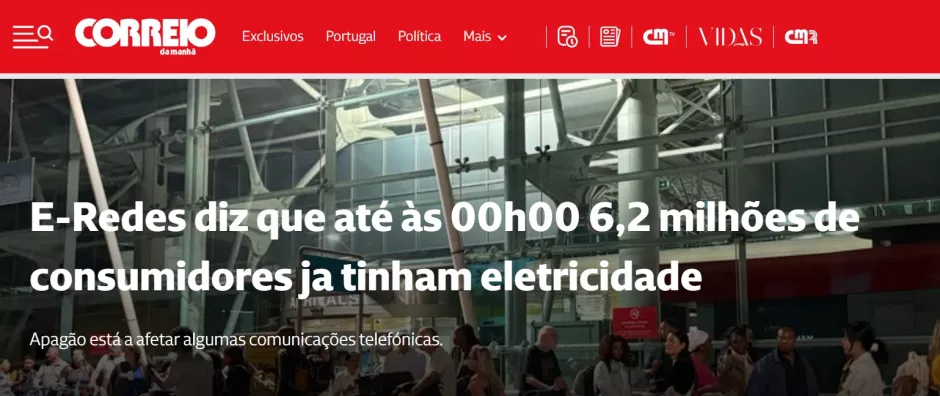 El diario ‘Correio de Manhá’ echa la culpa del apagón en Portugal a España, diciendo que el colapso eléctrico español provoca el caos en Portugal. «Nunca antes se había visto algo así, un país entero sin un corte de luz. Los que querían volver a casa vivieron horas de desesperación. No había transporte y el tráfico no se movía».