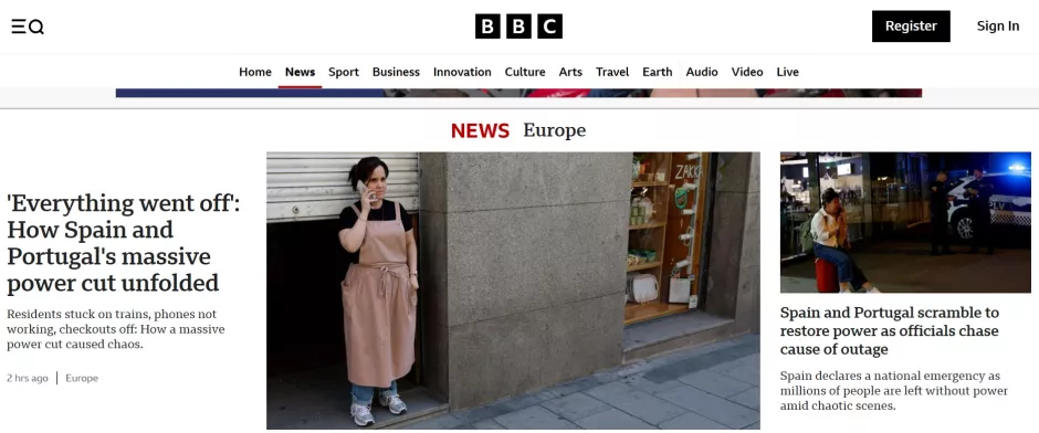 La ‘BBC’ abre con la siguiente frase: «Todo se fue al garete: así se desarrolló el masivo apagón en España y Portugal». Para posteriormente explicar en el subtítulo el caos que ha generado el apagón eléctrico con personas atrapadas, teléfonos sin funcionar, cajas cerradas, etc… También cuentan que España y Portugal está tratando de restablecer el suministro eléctrico en todo el país y que las autoridades aún siguen investigando las posibles causas. «España declara la emergencia nacional».