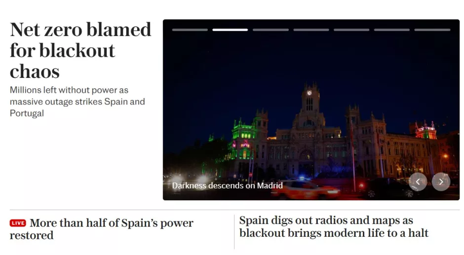 El diario británico ‘The Telegraph’ abre el periódico anunciando que ha habido un «cero neto» que ha causado el apagón eléctrico en España y Portugal. También informan de que tres cuartas partes del suministro de España ya se han restablecido y que en nuestro país se han sacado radios y mapas mientras el apagón ha detenido la vida moderna que conocemos hoy en día.