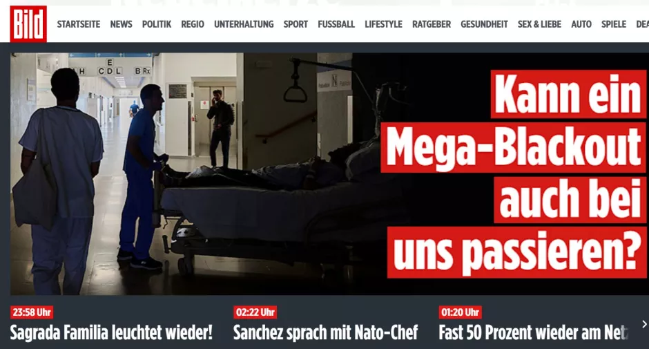 «¿Podría producirse aquí también un gran apagón?», se pregunta el diario alemán Bild. Bild también informa que la Sagrada Familia de Barcelona ha vuelto a iluminarse, que Sánchez ha hablado con el jefe de la OTAN, y que caso el 50 % de la energía eléctrica se ha restablecido en España.
