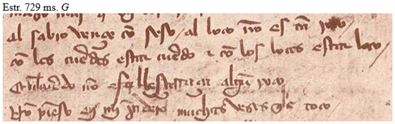 Adapta el Arcipreste aquí el verso 371 del Pamphilus (ed. Bonilla, 1917): «Est stultus stulto, et miti mitis ut agnus», que podría traducirse como: ‘Sabe ser tonto con los tontos y manso con los mansos, como un cordero’. La estrofa 729 desarrolla el juego de comparaciones a lo largo de sus cuatro versos, y en su estudio nos vamos a detener para tratar de reconstruir su texto, parcialmente ininteligible debido a la corrupción que ha sufrido hasta llegar a los manuscritos G y S que la recogen. Reproducimos ambas versiones según su lectura aparente, añadiendo los signos de puntuación que le faltan y prescindiendo de algunas abreviaturas que dificultan su comprensión: