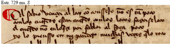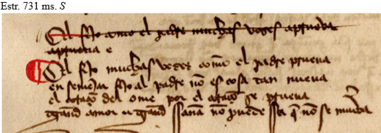 Siendo los versos segundo a cuarto prácticamente iguales en los mss. G y S, en el primero existe una diferencia radical entre ambos que va a demostrar lo que tantas veces hemos dicho: el ms. S es una burda copia del ms. G (o de otro muy similar a éste). El amanuense del ms. S se decide en un primer momento a copiar el primer verso que leemos en el ms. G, transcribiéndolo tal cual estaba en su modelo; pero a continuación lo tacha y vuelve a iniciar el verso, una línea más abajo, dispuesto a darle una nueva redacción que comenzará con la palabra aprueba. Pero tampoco es de su gusto el verso que ha empezado a recrear y tacha también esta palabra, volviendo a escribir un verso ligeramente distinto otra línea más abajo: «El fijo muchas bezes como el padre prueva». La razón de este cambio acaso podría ser que el copista mantiene la misma duda que a nosotros nos asalta: ¿qué es lo que el hijo muchas veces aprueba?.. la respuesta queda en el aire, pues al verbo transitivo aprobar le falta el complemento directo, que no puede estar implícito como cuando nos expresamos en el contexto de la enseñanza académica, donde necesariamente se entiende que lo que se aprueba son exámenes o asignaturas. Así que este copista, sin que su resultado sea satisfactorio, pues tampoco nos dice qué es lo que el hijo prueba, se delata como el falsificador que es.