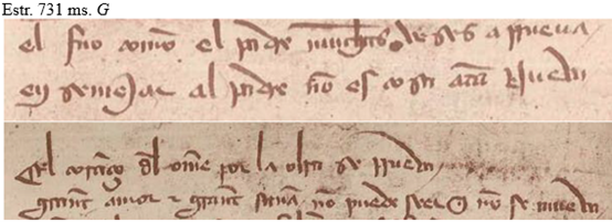 -El sintagma malsonante algún poco está escrito con abreviatura, elidiendo la consonante n de la primera palabra mediante el uso de una virgulilla situada sobre la vocal precedente: algũ poco. Pero el empleo de estos signos de abreviación da lugar a frecuentes errores de transcripción cuando un texto pasa sucesivamente de unas manos a otras, ya que es muy fácil confundir una virgulilla con un apóstrofo, que se utiliza para unir dos palabras elidiendo sonidos, normalmente una vocal. Con esta consideración, podemos suponer que la lectura del ms. G deriva básicamente del siguiente proceso de corrupción: