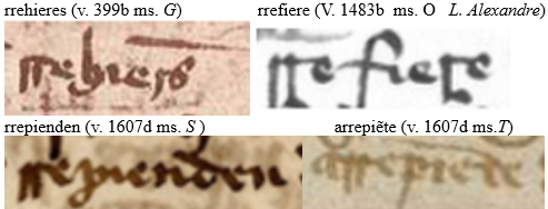 En el verso tercero el Arcipreste está hablando de sí mismo en cada uno de sus dos hemistiquios expresando su propio gusto; pero creemos que en el cuarto lo que pretende es generalizar, extendiendo su inclinación a un sujeto abstracto para justificar que su apetencia es la normal, la esperable de cualquier otro hombre con dotes naturales de seductor, ya que en todo el episodio no hace más que dar razones y ejemplos extraídos de la naturaleza para justificar el mayor valor de lo pequeño sobre lo grande. Y ese sujeto genérico en el que descargar la preferencia de las mujeres chicas por las grandes no puede ser otro que un ‘proco’, cultismo poco conocido en la época del Arcipreste, que ya utilizó en la estrofa 729 -que hemos reconstruido en un reciente trabajo- y que definirá cuatro siglos después el Diccionario de Autoridades (Tomo V, 1737): «PROCO. s. m. El que pide con repetidas ansias a una mujer para poseerla en el matrimonio, y más propiamente fuera de él. Es voz Latina y de poco uso. Latín. Procus» (hemos actualizado su ortografía). De esta manera, encajaría en el contexto que el verso quisiera decir: «y las chicas por las grandes no son rechazadas por el proco [o no se rechazan del proco]». La cuestión es encontrar una forma verbal de parecida grafía a ‘arrepienten’ o ‘rrepienden’ que por su rareza u obsolescencia pudiera haber confundido a un primer copista causante de la alteración del texto original. Y esa alternativa la encontramos en ‘refieren/rehieren’, del verbo ‘referir/reherir’ que significaba ‘rechazar, repeler, refrenar’. El Arcipreste utiliza la forma verbal ‘rrehiere’ en la estrofa 399, pero solamente en el ms. G -no consta en el ms. T y en el ms. S se sustituye erróneamente por requiere- en una reprobación que el poeta hace al dios pagano Don Amor reprochándole los sufrimientos que causa a aquellos amantes a los que rechaza conceder sus favores: «das muchos enemigos al cuerpo que rehieres». Otro ejemplo de su uso lo encontramos en el ms. O del Libro de Alexandre, en cuyo verso 1483b, en relación con una piedra preciosa a la que supone propiedades mágicas, se dice que «rrefiere las tempestas que vienen en las nuves»; es decir, refrena o contiene las tempestades. Compararemos la grafía de la palabra rrehieres de la estrofa 399 con la del mencionado ms. O y con las respectivas formas verbales que recogen los manuscritos que comentamos para la estrofa 1607. Veremos cómo tanto la hache del ms. G como la efe del ms. O de la segunda sílaba se pueden confundir fácilmente con una letra pe. Así mismo, la letra erre de la tercera sílaba tanto en el ms. G como en el O son gráficamente muy similares a la letra te de arrepiẽte en el ms. T: