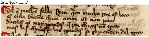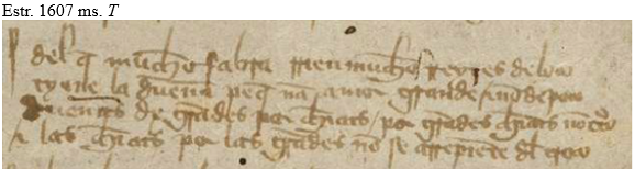 Analizaremos la estrofa 1607 en los dos únicos manuscritos en los que nos ha llegado: uno de ellos el ms. T, y otro el ms. S, al que tantas veces hemos calificado como una burda manipulación de su manuscrito de base, efectuada de mala fe para obtener un producto de hermosa grafía y fácil lectura, aun totalmente infiel a su original. El ms. T, por el contrario, con su grafía descuidada y tosca, sigue de cerca al manuscrito más fidedigno que recoge parcialmente la obra del Arcipreste, el ms. G, con el que desgraciadamente no podemos contar ahora porque no recoge este episodio.
