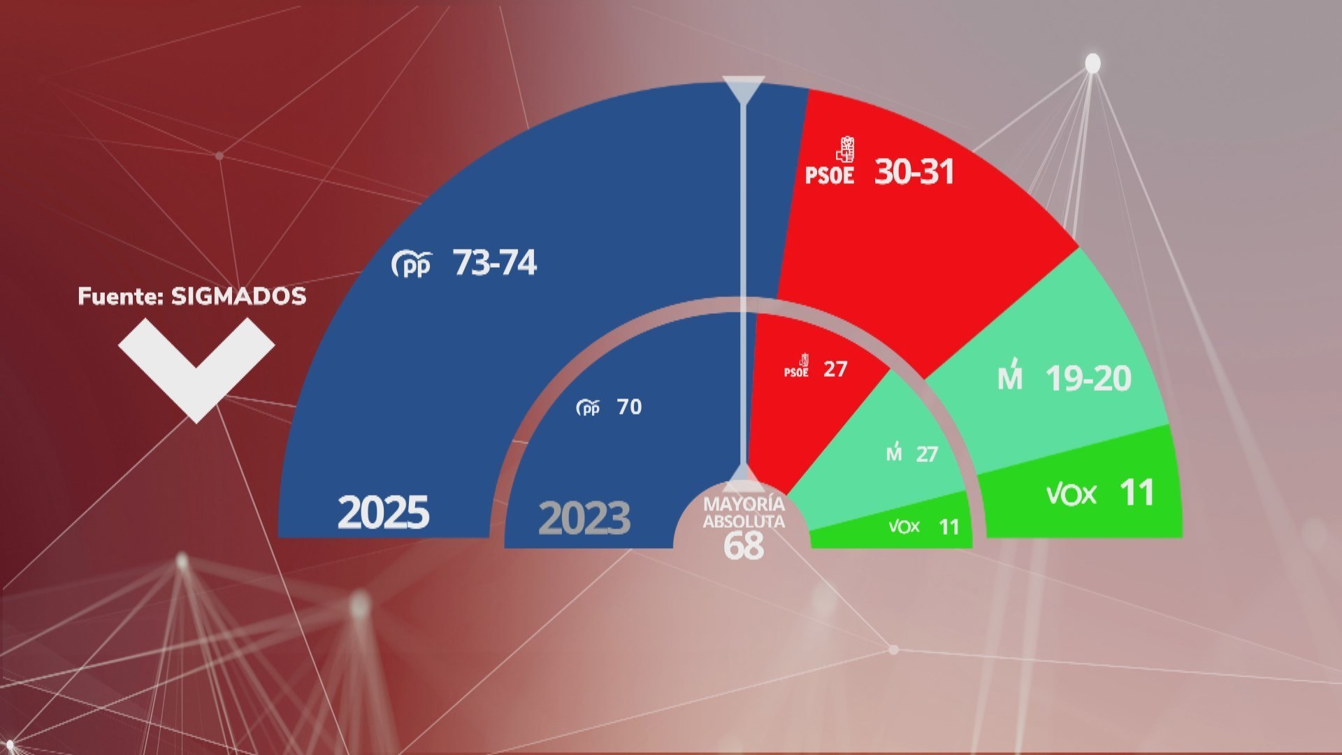 El PP obtendría entre 73 y 74 escaños, es decir, hasta 4 más que en las últimas elecciones autonómicas. El Partido Socialista entre 30 y 31 escaños, subiendo también 4, mientras que Más Madrid continuaría su bajada con entre 19 y 20 diputados, perdiendo más de 7 escaños.