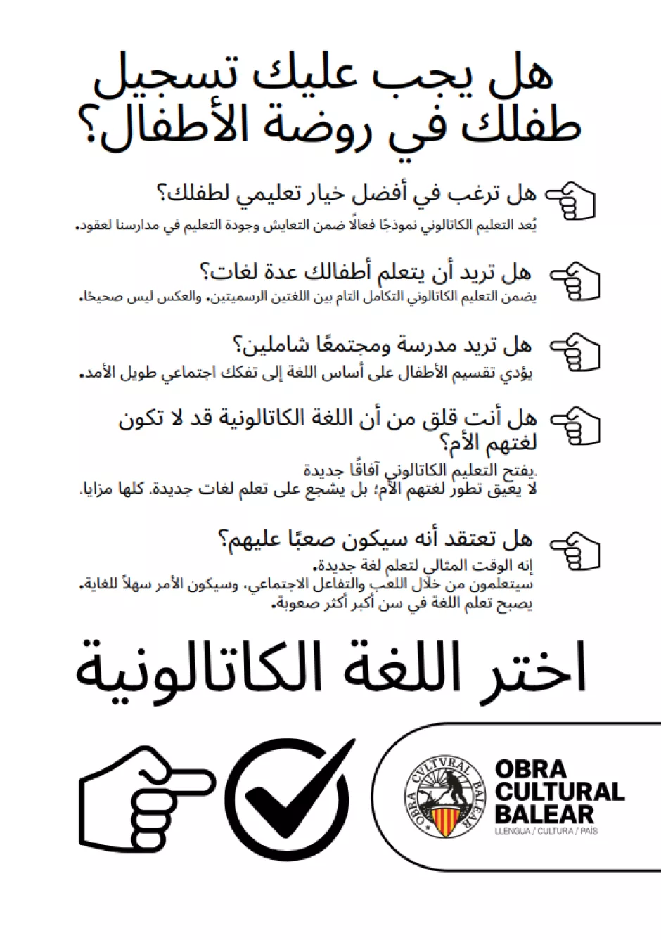 Según consta en su página web, esta entidad ha publicado la campaña no solamente en español y valenciano, sino también en árabe. «¿Debes matricular a tu hijo en la guardería? Elige el catalán», reza el grande el panfleto de la campaña informativa. «¿Quieres la mejor opción educativa para tu hijo? La educación catalana es un modelo eficaz de convivencia y calidad educativa en nuestras escuelas desde hace décadas. ¿Quiere que sus hijos aprendan varios idiomas? La educación catalana garantiza la plena integración de las dos lenguas oficiales. Lo contrario no es cierto», continúa.