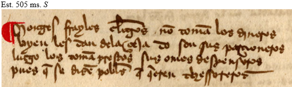 Pero antes de analizarla es preciso explicar que en el otro manuscrito en que nos ha llegado, el ms. S, esta estrofa recoge una diferente lectura y se encuentra en distinta posición dentro del conjunto en que se integra. He tenido ocasión de pronunciarme en numerosas ocasiones sobre el valor filológico de cada uno de estos manuscritos y creo necesario repetir aquí que el ms. G, a pesar de sus errores involuntarios, es el más fidedigno al texto original que escribió el Arcipreste, mientras que el ms. S -muy posterior- es la obra de un manipulador totalmente consciente de su felonía, más interesado en ofrecer al lector un producto dotado de buena letra y fácil lectura antes que fiel a su texto de referencia. Y es precisamente el escriba del ms. S el principal causante de la confusión que ha llevado a editores y críticos a no encontrar la clave para desentrañar el significado del verso, al alterar el orden de esta estrofa en el episodio. Si bien en el ms. G parece deducirse, sin gran esfuerzo, que la estrofa 505 se refiere en general a la aparente hipocresía de los religiosos, que predican la pobreza haciendo ascos al dinero pero que luego lo reciben con avidez de quienes tienen el encargo directo de recaudarlo, en las dos estrofas siguientes, y esta vez de un modo diáfano, se entra de lleno en otro tema distinto, que es el de la herencia de los moribundos, por la que todos los religiosos parecen pelearse. Pero el copista del ms. S, no entendiendo bien la estrofa 505 (por culpa de la expresión “dar de la ceja”, de la palabra “parcioneros” y, en general, de su extraña sintaxis) decidió alterar su orden incorporándola entre las dos que se referían al tema hereditario. Y no contento con ello, intercambió entre sí los dos primeros hemistiquios de las estrofas 505 y 506 del ms. G, con alguna pequeña modificación para acomodar ambas estrofas a su personal gusto. Así, si los dos primeros versos de estas dos estrofas son, según el ms. G (copio literalmente):