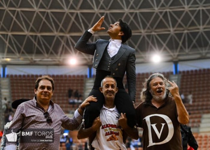 El cuarto, de Carmen Lorenzo, no salió de su querencia de los terrenos de toriles ni cuando Sergio Galán le colocó los rejones de castigo. Muy aquerenciado, todo lo tuvo que hacer Sergio Galán, que destacó a lomos de ‘Bambino’ en las tablas. Remató la actuación con un par a dos manos y aunque el rejón fue muy defectuoso -por contrario y muy trasero- sí que fue efectivo. Como el toro cayó sin puntilla rápidamente, el público pidió la oreja para Sergio Galán como recompensa a la faena de mérito y el presidente la concedió.
