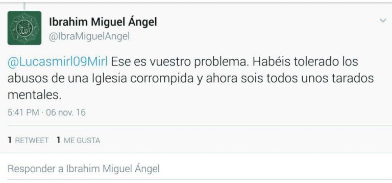 Ibrahim Miguel Àngel Pérez Ramírez se convirtió al islam tras casarse con la marroquí Afifa Azzouz. Desde su plataforma, el ex de Podemos cargó contra los católicos de forma inmisericorde. Considera que el sacramento cristiano de la confesión es “un instrumento para encubrir a los pederastas” y ha llegado a calificar el Catolicismo como “una mierda de religión” y a los católicos de “tarados mentales”.