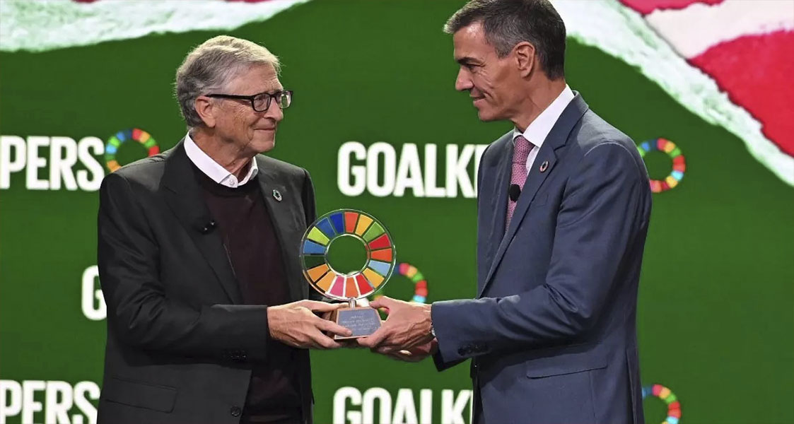 Recordemos también que Pedro Sánchez nada más llegar al poder “donó” 130 millones de dólares a la fundación Bill & Melinda Gates y varias partidas en años posteriores. ¿Era para comprar el premio Goalkeepers que le acaba de otorgar la fundación? El propio Henri Gates III, más conocido como Bill Gates, le hizo su entrega aprovechando el viaje a Estados Unidos. La instantánea que inmortaliza el momento no puede ser más vomitiva a la vez que inquietante: Un Satanás entregando un trofeo con la imagen de la Agenda 2030 a otro Satanás. Y las palabras elogiosas de este mecenas del Mal al okupa de la Moncloa no pueden ser más tenebrosas: “España está en el lado bueno de la Historia”. ¡Qué terrible sentencia!