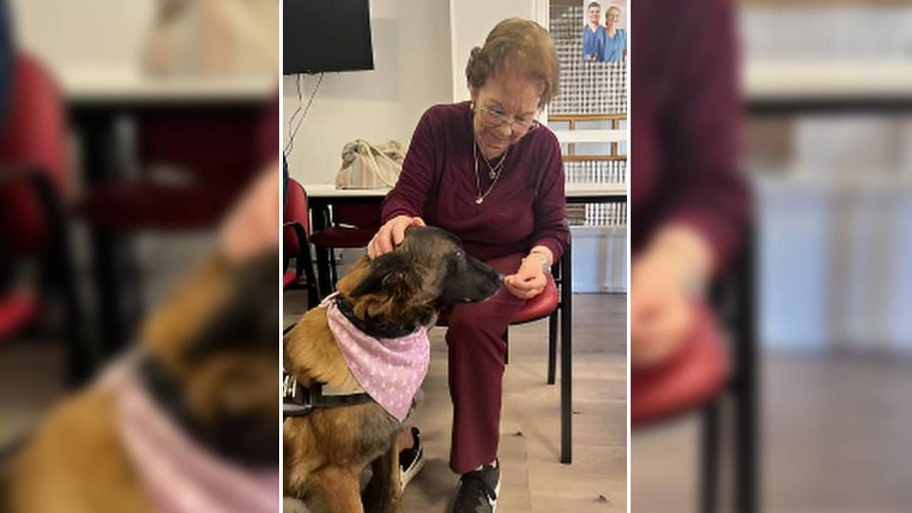 Karma, una perra de raza pastor belga, ha vuelto por segundo año consecutivo a las residencias de Galapagar para acompañar a los mayores. Un servicio de terapias asistidas con animales que se realizan en las residencias del municipio para mejorar la salud física y emocional de las personas mayores.