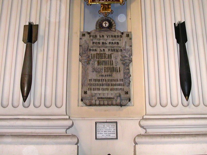 Curiosamente, las dos bombas que cayeron dentro del templo, están expuestas el uno de los pilares cercanos a la capilla de la Virgen, junto con las banderas hispanoamericanas de Méjico, Haití, Costa Rica, Perú y El Salvador, en recuerdo de este episodio protagonizado por los mismos que empaparon de sangre nuestro solar patrio con la sangre de miles de mártires, y que, por su cristofobia, intentaron destruir uno de los mayores símbolos de la fe católica.