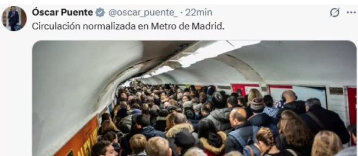 El ministro de Transportes, Óscar Puente, ha vuelto ha publicar un bulo sobre Metro de Madrid. En esta ocasión ha denunciado las aglomeraciones del suburbano con una imagen del ferrocarril de París. El líder de la cartera ha escrito un tuit en redes sociales donde se puede ver la instantánea junto a la frase «circulación normalizada».