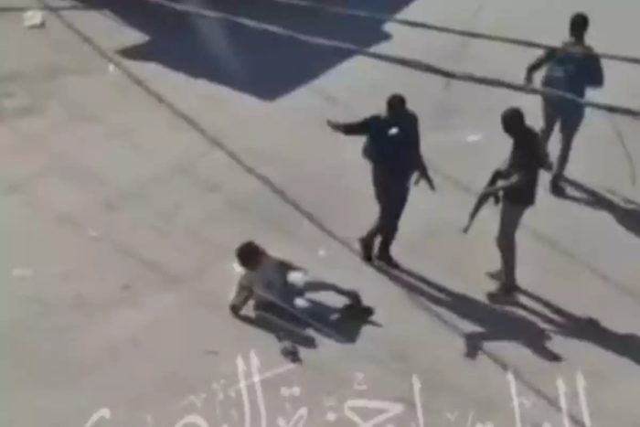 En otro vídeo, se ve a un hombre en topless siendo arrastrado boca abajo por las muñecas atadas entre la multitud por dos hombres enmascarados. Descalzo y vestido únicamente con un chándal, es arrojado al suelo antes de recibir patadas en el torso y las espinillas por al menos cuatro matones armados.