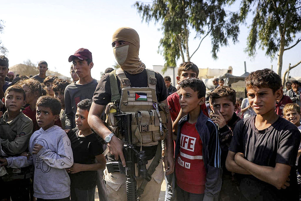 En la imagen: un miliciano de Hamás entre una multitud de escudos humanos, en Deir el-Balah, Franja de Gaza, el pasado día 13.