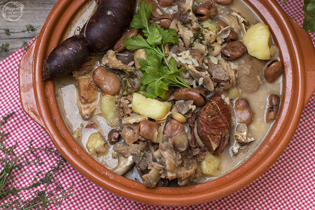 Como mencionaba, este aporte calórico extraordinario para combatir el frio, lleva del cerdo todo, salvo los andares como diría un castizo (jamón, rabo, costillas, manos, oreja, espinazo, chorizo, y pringá, mucha pringá… ) legumbres (habas, garbanzos), patatas, arroz y hinojo. Sin que le falte habas secas, y algunas legumbres y hortalizas del terreno. También se le puede añadir en ocasiones, garbanzos, hinojos, alubias blancas, arroz, cebolla, ajos o pimientos choriceros para aumentar más aún su sabor, y acompañada de encurtidos y de remojón granaíno (aceitunas negras, cebolletas, naranja, lomo de bacalao…). Y todo ello, guisado a fuego lento y mucho cariño.