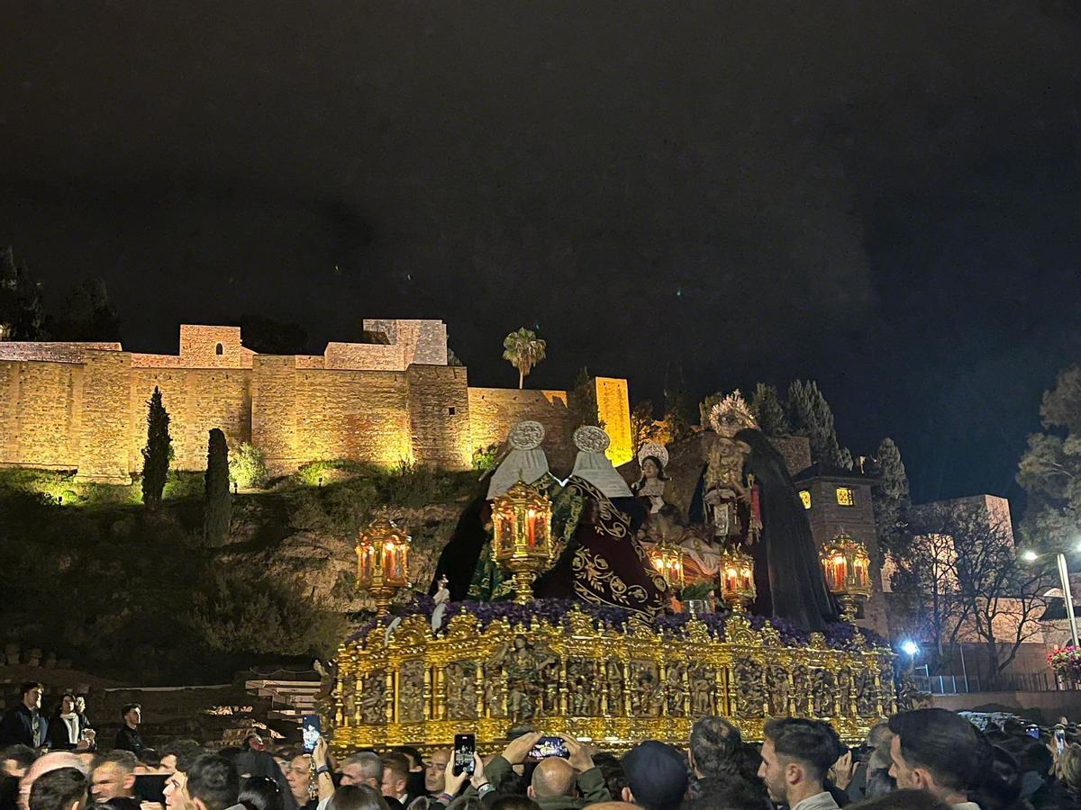El entorno del Paseo del Parque y el acuciante sol de la tarde deslumbraban con destellos la orfebrería de la Virgen de las Angustias que avanzaba por la avenida de Cervantes, delante del Ayuntamiento, mientras el Señor del Descendimiento se dirigía camino de la Catedral, para llevar a cabo su estación de penitencia, a un paso cadencioso a los sones de las marchas procesionales que interpretaba la Asociación Musical Juvenil de Cruz de Humilladero. La cofradía sufrió un parón de unos minutos cuando discurría por Atarazanas y el Monte Calvario aún no había abandonado esta vía.