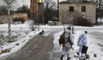 Militares ucranianos patrullan una calle en la aldea de Verjnotóretske, en la región de Donetsk (Ucrania), 22 de enero de 2022. Rusia insta a Estados Unidos a que “adopte una postura constructiva, tranquila...