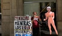 Una muñeca hinchable contra la OTAN frente a la sede de la Comisión Europea en Barcelona