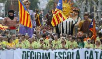 Pancarta de cabecera de la manifestación en Barcelona, a su paso por el Arco del Triunfo, en defensa de una escuela en catalán. Ángel Boya.- El complejo de inferioridad de los nacionalistas se traduce entre otras...