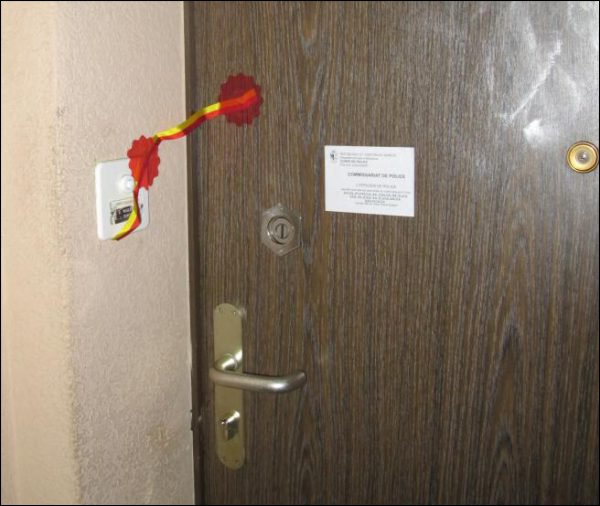 Puerta precintada del domicilio de la víctima española. Un kosovar de 42 años ha sido detenido como el presunto autor del degollamiento en Suiza de un español de 78 años de edad, al que robó miles de francos....