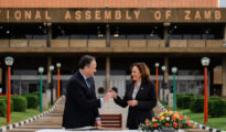 La vicepresidenta de EE.UU., Kamala Harris, mientras visita la Asamblea Nacional de Zambia, en Lusaka, el 31 de marzo de 2023. El veterano periodista y presidente del Partido Socialista de Zambia, Fred M’membe,...