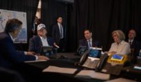 La ministra de Defensa Margarita Robles parece decirle al embajador norteamericano en España, Benjamín León, “yo estoy con Trump”. La frase que parece escucharse en los planos previos a la entrevista...