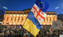 Un manifestante ondea las banderas de Georgia, Ucrania y la UE durante una protesta frente al Parlamento georgiano en Tbilisi, el 8 de marzo de 2023. El primer ministro georgiano, Irakli Garibashvili, acusó al...